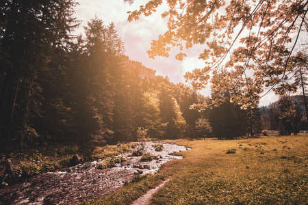 Toned photo of beautiful forestal river and meadow, surrounded by trees.