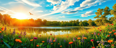 A scenic view of a lake surrounded by lush greenery, wildflowers, and trees, bathed in the golden light of a setting sun with a single bird flying overhead.