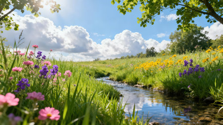 Narrow, flowing stream reflecting a bright blue sky, framed by lush green grass, vibrant pink and purple wildflowers, yellow blooms, and sun flare bursting above white cumulus clouds.
