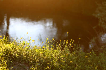 Yellow flowers growing by the river, illuminated by warm golden hour light. Selective focus.