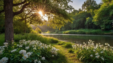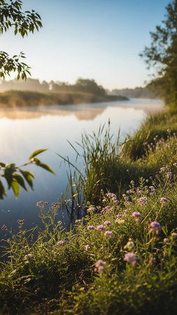 A tranquil riverside scene at sunrise, with soft mist rising from the water, bordered by green grass and blooming wildflowers.