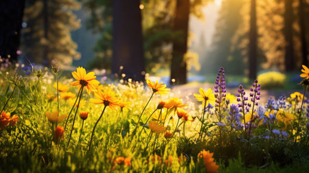 Beautiful wildflowers blooming in the forest at sunset.