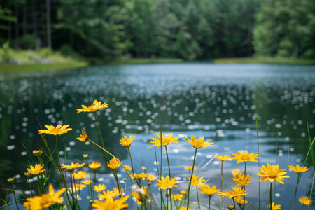 Bright yellow wildflowers bloom by the edge of a tranquil lake, with a serene forest background and gentle ripples on the water.