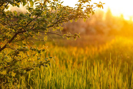 Landscape at sunset. Densely overgrown trees and shrubs with dense green foliage. Willow, bird cherry, kowan, wild rose.