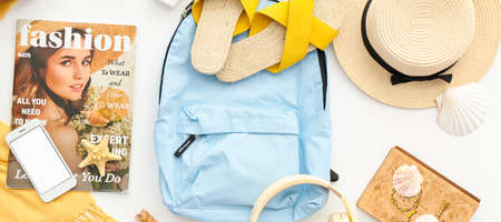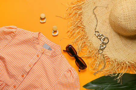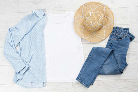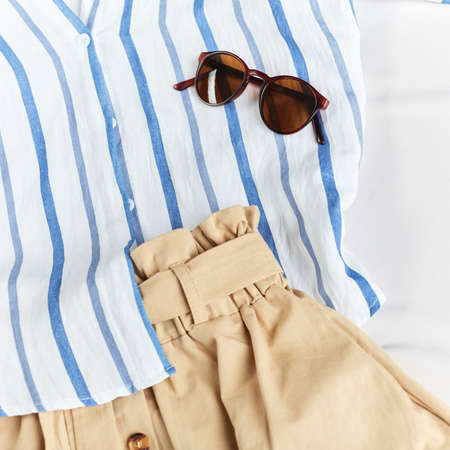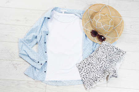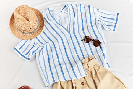Casual spring/summer female clothing set. Vacation clothes and accessories concept.
