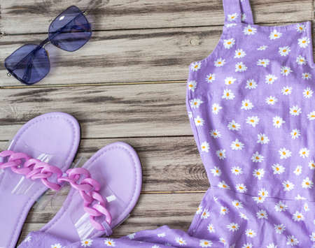Womens summer clothes in purple shades (glasses, dress, beach slippers). Shopping Concept. Flat layout, space for lettering.