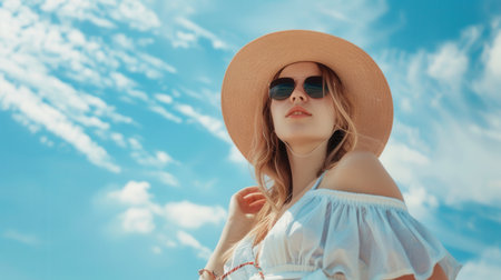 The woman stands confidently in a light summer outfit, wearing sunglasses and a wide-brimmed hat while gazing upwards at fluffy clouds.