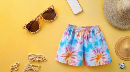 A vibrant flat lay featuring colorful tie-dye swim shorts, trendy sunglasses, and summer accessories on a cheerful yellow backdrop, perfect for beach days.