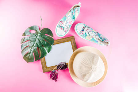 Summer fashion background on pink, trendy straw bag, fedora hat, leather sandals and yellow sunglasses, flat lay, top view, selective focus