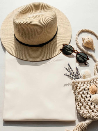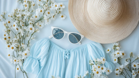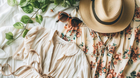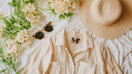 A serene flatlay featuring a soft blouse, a wide-brimmed hat, and stylish sunglasses surrounded by beautiful flowers, perfect for summer aesthetics.