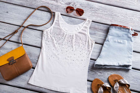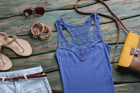 Women's clothing - blouses, bermuda shorts, leather sandals pumps, cross body bag on a light background, top view