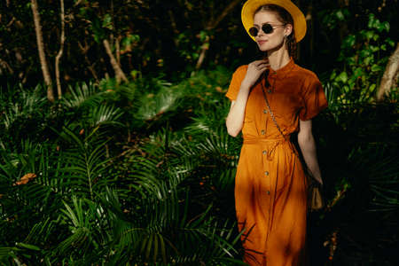 Woman tourists in sunglasses and jungle hat island travel fresh air