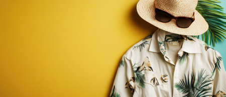 Bright yellow backdrop showcases a tropical shirt straw hat and sunglasses evoking a cheerful summer vacation vibe with vibrant colors.