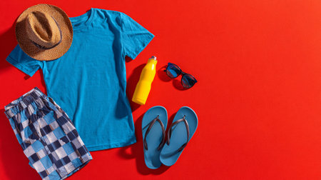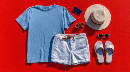 Stylish summer flat lay composition, casual blue t-shirt and shorts set with travel accessories, red background, premium mockup aesthetic