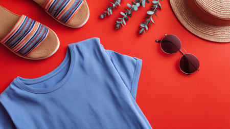 Vibrant red backdrop flat lay featuring blue t-shirt mockup and coordinated summer outfit, neat clean fashion presentation