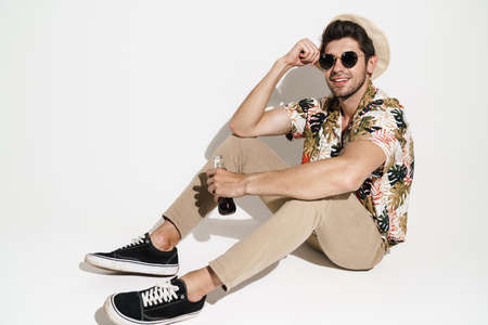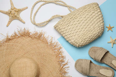 Beach accessories on white background. Straw hat, sunglasses, seashells.