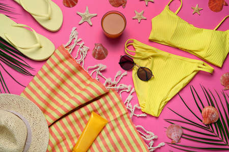Overhead view of woman's swimwear. Summer fun background. Summer beach accessories on pink blue pastel background. Top view. Flat lay style.