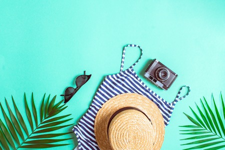 Summer vacation and travel concept. Beach accessories things - bag, hat, swimsuit, sunglasses, camera, tropical leaves on aquamarine, turquoise blue backdrop. Summer is coming trendy concept