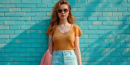 Stylish lady carries mesh bag posing against striking turquoise brick wall. Concept Fashion, Street Style, Accessories, Colorful Backgrounds, Chic Outfits