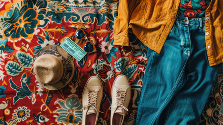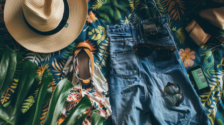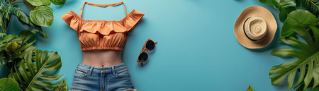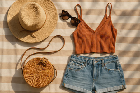 Flat lay of boho summer essentials featuring a straw hat, sunglasses, a knitted crop top, denim shorts, and a woven bag. perfect for showcasing trendy summer fashion with a natural and relaxed vibe. ideal for style inspiration.