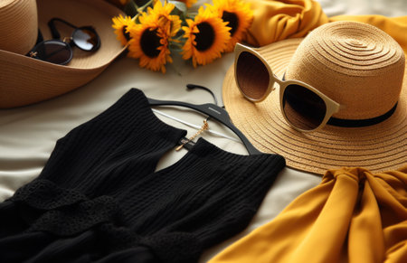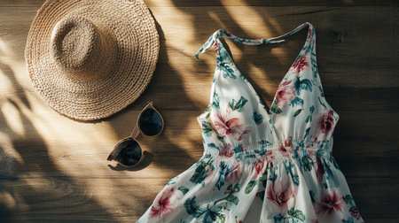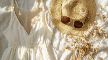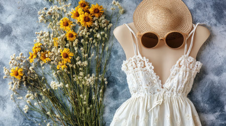 This visually appealing arrangement features an elegant summer dress, stylish sunglasses, and dried flowers, creating an inspiring fashion and lifestyle composition for seasonal imagery.
