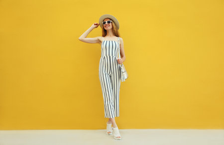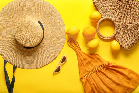 Summer fashion outfit background with straw hat, jeans, flip flops, sunglasses, handbag on yellow