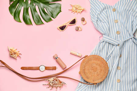 Fashion summer women's clothes set with accessories on pink background, Flat lay, Top view