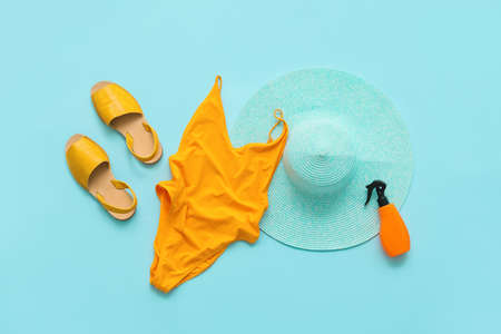 Top view summer composition of a bathing suit, straw hat, sunglasses and tropical flowers on a turquoise background. The concept of travel and vacations