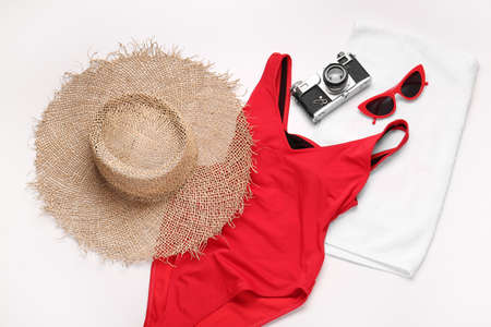 Set of baby summer accessories. Swimsuit for girl, kids toys and bib on white background. Top view, flat lay. Child holiday concept