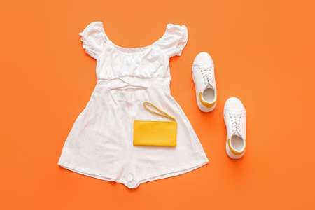 Composition with female clothes, shoes, accessories and citrus fruits on color background