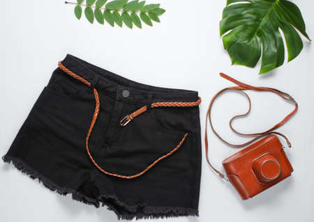 Black denim shorts with a leather belt, retro camera in cover on white background with green tropical leaves. Top view