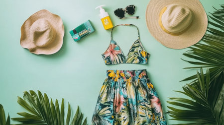 A vibrant flat lay arrangement featuring a tropical summer outfit with floral swimwear, straw hats, sunglasses, and sunscreen against a mint green backdrop, perfect for vacation vibes.