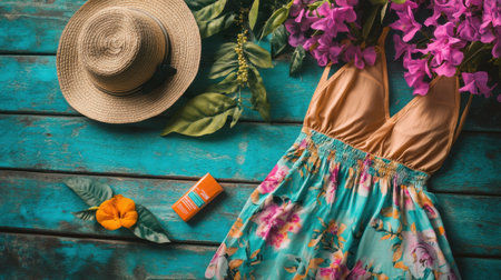 A charming summer scene featuring a floral dress, a straw hat, sunscreen, and vibrant orchids on a rustic blue wooden surface, perfect for vacation vibes.