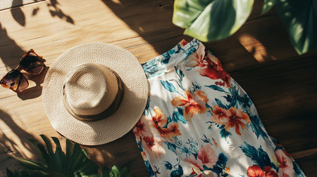 A flat lay of summer fashion essentials including a straw hat, sunglasses, and a floral dress.