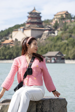 Woman sitting on park relaxing at lake view of Summer Palace in Beijing, China.