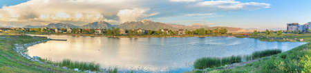 Panoramic view of the residential area against the mountain range background at Daybreak, Utah