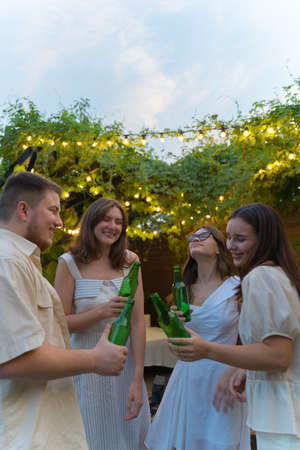 Summer party with friends. Dancing outside under light bulbs on the patio. Beer in hand. Celebrating Together