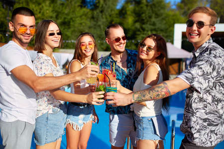 Group of friends having fun at poolside summer party clinking glasses with summer cocktails on sunny day near swimming pool. People toast drinking fresh juice at luxury villa on tropical vacation.