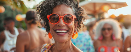 Embrace the festive vibes with these joyous souls at a sunlit outdoor party, where smiles, quirky sunglasses, and feathered headwear signal ultimate summer fun. Party Time. Summer Vibes. Generated A.I.