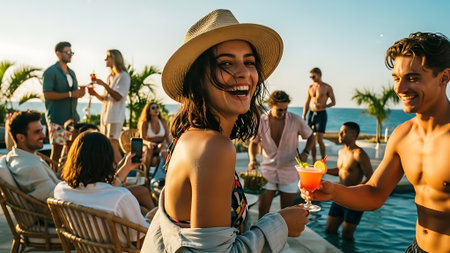 Friends Enjoying Tropical Drinks at an Outdoor Summer Party.