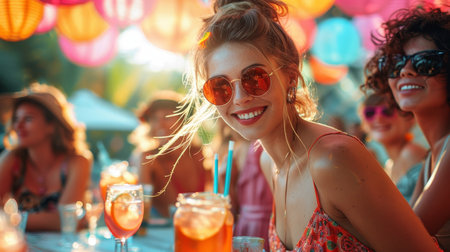 Cheerful young woman enjoying a lively outdoor party with friends in the summer.