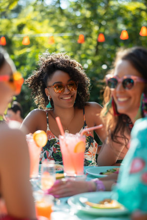 A vibrant summer gathering featuring friends enjoying food and drinks in a lush backyard. The scene captures joy, laughter, and connection in a lively outdoor setting.