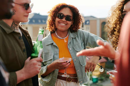 Happy young black woman in sunglasses and casualwear holding cocktail in martini glass while standing among her friends communicating