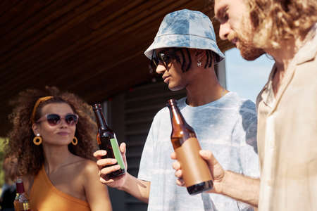 Happy joyful young people toasting with glasses and beer bottles when having small party on pier