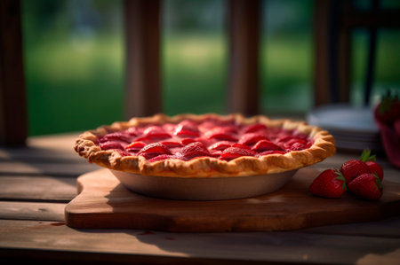 A beautifully crafted strawberry pie with a golden, flaky crust and fresh strawberries. The pie is perfect for a summer dessert or a special occasion.
