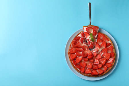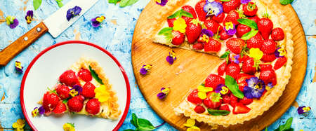Sliced strawberry pie decorated with edible flowers and mint.Trendy summer berry pie