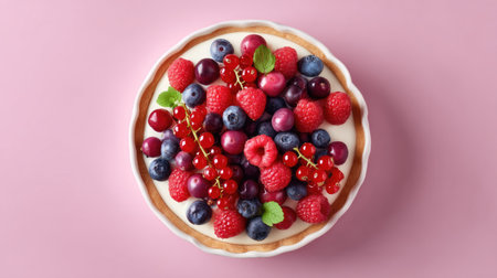 A vibrant berry tart featuring an assortment of fresh raspberries, blueberries, and red currants, garnished with mint leaves, perfect for dessert lovers.