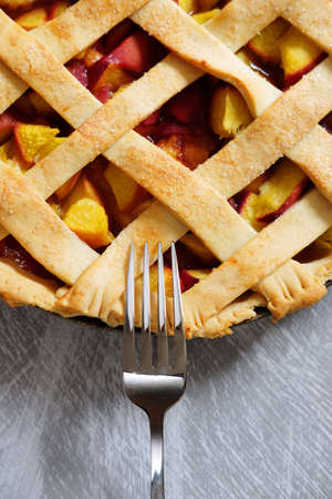 Peach filling for tasty summer fruit pie with chopped peaches in water-logged dough