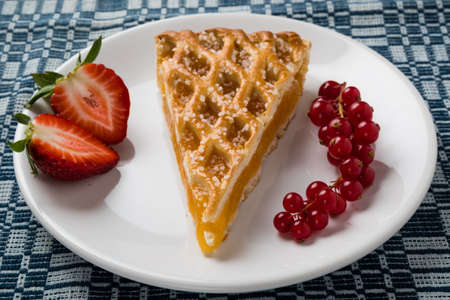 Portion of pie with jam on a white ceramic plate over a white concrete background