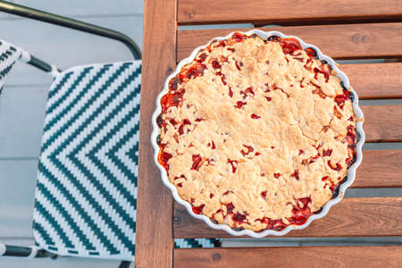 Homemade pie with berries on wooden table texture. Summer photo receipts